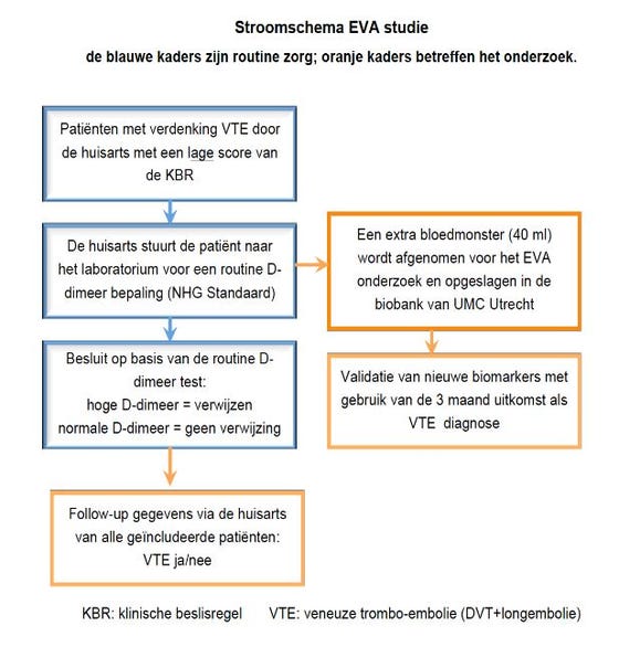 Om de D-dimeer test weer terug te krijgen in de huisartspraktijk, is het EVA onderzoek gestart. EVA staat voor EVAluatie biomarkers bij VTE onderzoek.